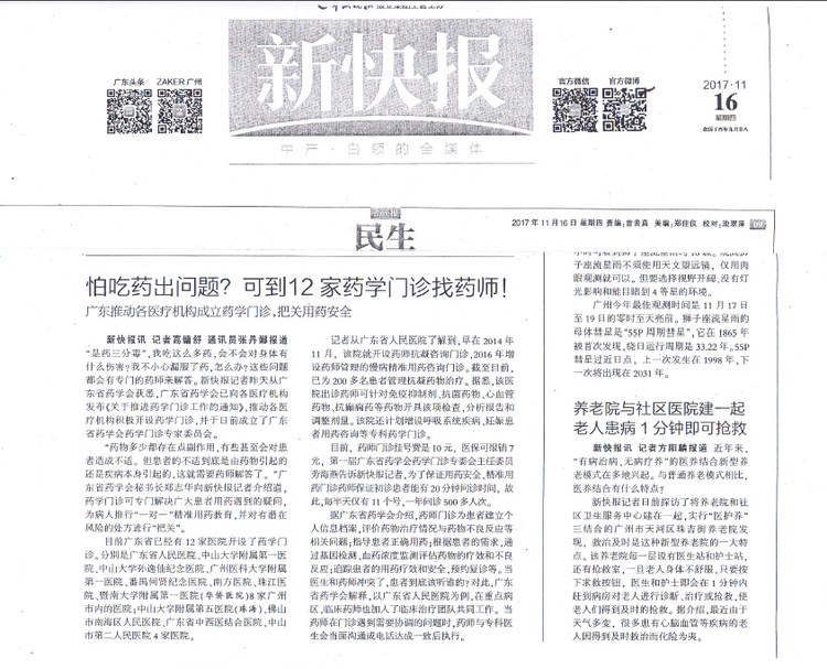 2017年11月16日,《新快報》以“怕吃藥出問題?可到12家藥學(xué)門診找藥師”為題,詳細(xì)報道了廣東省藥學(xué)會推動各級醫(yī)療機(jī)構(gòu)成立藥學(xué)門診系列工作。
