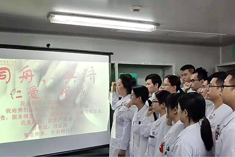 廣州醫(yī)科大學附屬第一醫(yī)院藥學部藥師們以“南山精神”為榜樣,莊嚴宣誓:勇?lián)人婪鰝姑?,盡心盡責,傾我所能,誓言所系,生命相托!