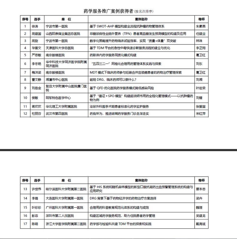 10月6日,中國藥學(xué)會藥學(xué)服務(wù)專業(yè)委員會采取函評及線上總審等方式,評選出藥學(xué)服務(wù)十佳案例10個、藥學(xué)服務(wù)推廣案例17個、藥學(xué)服務(wù)示范案例25個、藥學(xué)服務(wù)優(yōu)秀案例48個。