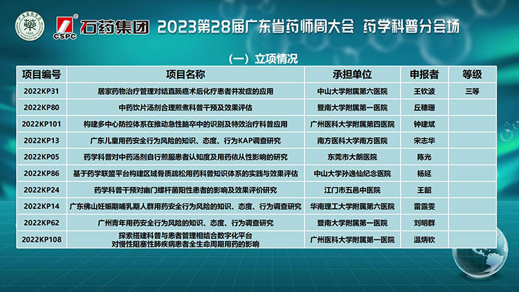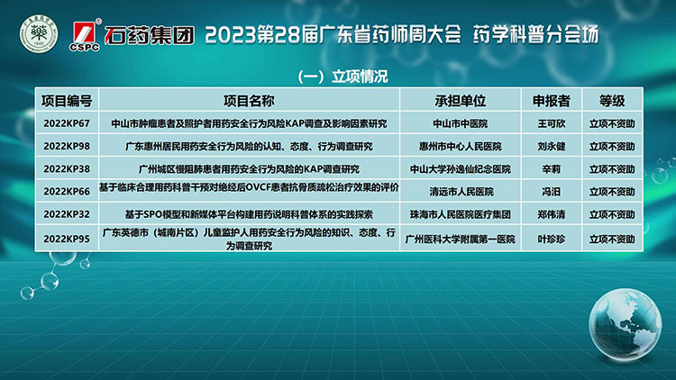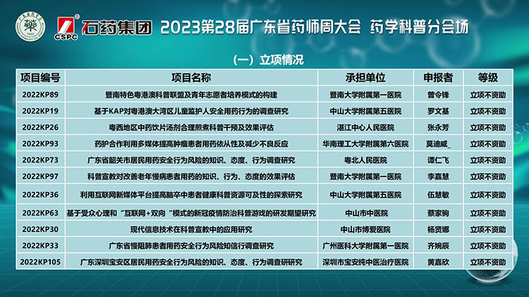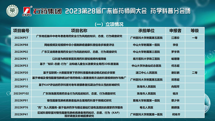 本環(huán)節(jié)分別由中山大學(xué)孫逸仙紀(jì)念醫(yī)院藥學(xué)部副主任余曉霞副主任藥師和廣州醫(yī)科大學(xué)附屬第一醫(yī)院藥學(xué)部主任魏理主任藥師主持,首先,大會(huì)向參與人員展示了2022年廣東省藥學(xué)科普研究基金立項(xiàng)情況,而后安排本次藥學(xué)科普立項(xiàng)排名前12名的立項(xiàng)人員對立項(xiàng)課題進(jìn)行簡短的講解與展示,廣州中醫(yī)藥大學(xué)第一附屬醫(yī)院主任藥師唐洪梅、中山大學(xué)孫逸仙紀(jì)念醫(yī)院主任藥師李國成、廣東省婦幼保健院主任藥師王穗瓊、中山大學(xué)附屬第一醫(yī)院主任藥師陳杰、廣州市紅十字會(huì)醫(yī)院主任藥師張述耀、中山大學(xué)孫逸仙紀(jì)念醫(yī)院主任藥師邱凱峰、南方醫(yī)科大學(xué)南方醫(yī)院主任藥師郭丹、廣東省中西醫(yī)結(jié)合醫(yī)院主任藥師吳曉玲、中山市人民醫(yī)院主任藥師劉銳鋒、南方醫(yī)科大學(xué)深圳醫(yī)院主任藥師楊西曉、南部戰(zhàn)區(qū)總醫(yī)院副主任藥師楊晨以及佛山市南海區(qū)人民醫(yī)院副主任藥師余靖華分別對分享的課題進(jìn)行點(diǎn)評,而后由暨南大學(xué)附屬第一醫(yī)院藥學(xué)部副主任王景浩主任藥師從評審角度為志愿者講述如何申報(bào)PSM廣東科普基金,并分享申報(bào)書的不足以及為大家傳授方法,希望通過本次培訓(xùn)以及優(yōu)秀科普展示提高在場志愿者對藥學(xué)科普基金立項(xiàng)的重視以及提高撰寫科普基金的能力,藥師志愿者通過藥學(xué)科普與管理與科研工作相結(jié)合,逐步實(shí)現(xiàn)形成“選題-實(shí)施-評價(jià)與反饋”的科普學(xué)術(shù)閉環(huán)。