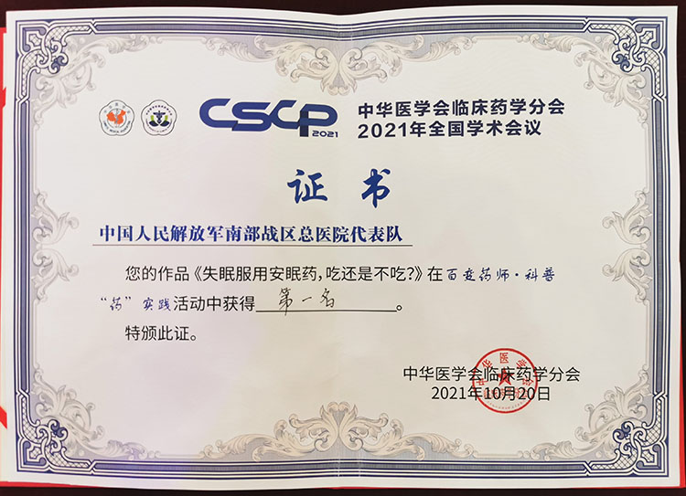 2021年10月20日,由廣東省醫(yī)學(xué)會(huì)臨床藥學(xué)分會(huì)選送的中國(guó)人民解放軍南部戰(zhàn)區(qū)總醫(yī)院(以下簡(jiǎn)稱“南部戰(zhàn)區(qū)總醫(yī)院”)的藥學(xué)科普作品從全國(guó)487個(gè)參賽作品中層層晉級(jí)、與15支代表隊(duì)逐鹿中原,榮獲中華醫(yī)學(xué)會(huì)臨床藥學(xué)分會(huì)百變藥師?科普“藥”實(shí)踐藥學(xué)科普大賽一等獎(jiǎng)。在決賽中南部戰(zhàn)區(qū)總醫(yī)院藥劑科藥師們精心編排了一場(chǎng)通過(guò)小品、視...發(fā)布時(shí)間:2021-11-03 15:16:43 | 瀏覽:1798 -